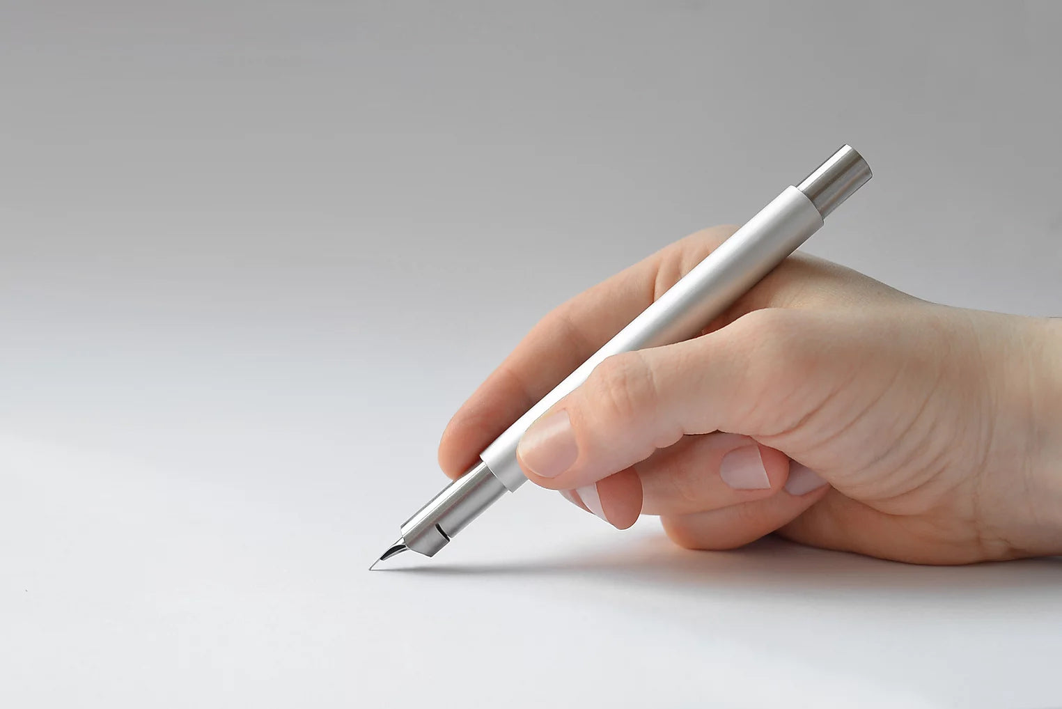 The 7000 aluminum is a cartridge/converter fountain pen with a minimalist approach and a strong focus on blending different materials and textures. While most of its construction is in stainless steel, the body is made in anodzed aluminum. Cap, section & body are push-pull to open/close.