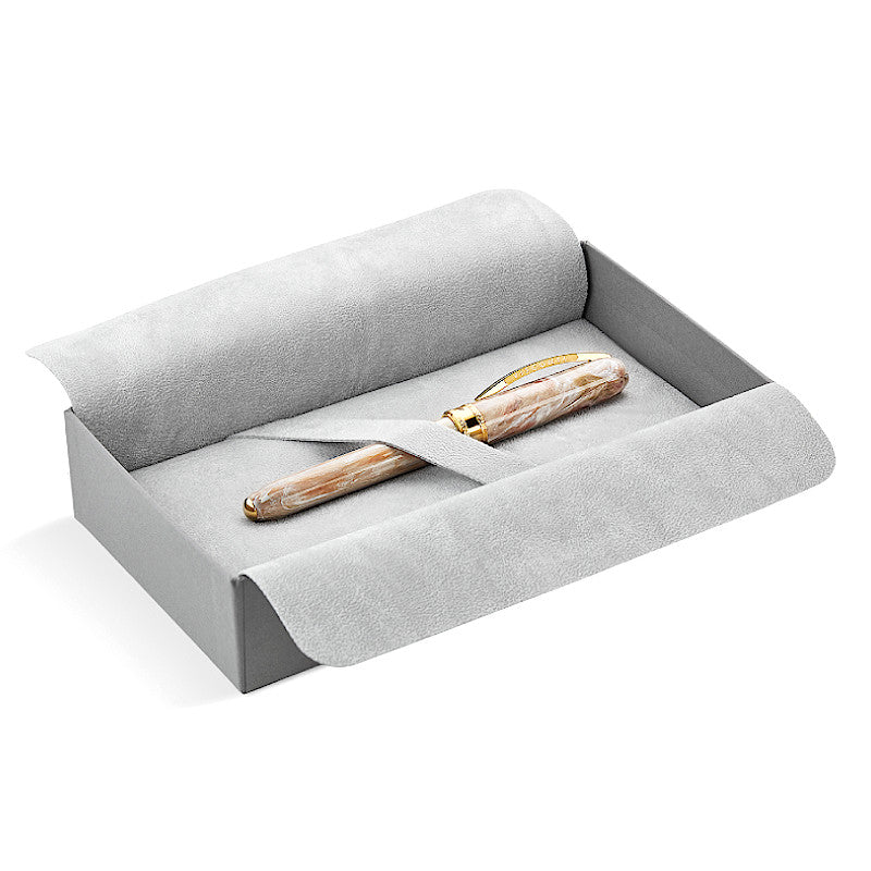 The Virgilio fountain pen features a refined acrylic resin body in shades of ivory, transitioning into hints of laurel green and touches of fire red, symbolizing wisdom and the passion for enlightenment.
